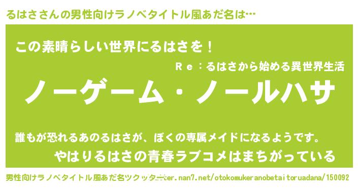 | 女子向けラノベタイトル風あだ名 | 『死神るはさの再婚』『るはさ伯爵の花嫁』 |