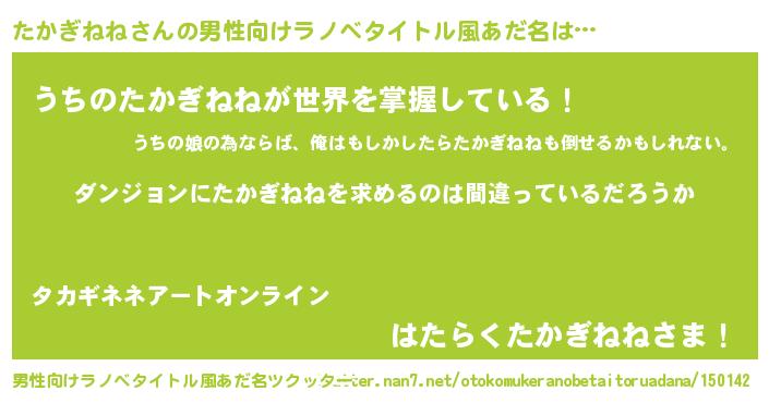 | 女子向けラノベタイトル風あだ名 | 『たかぎねねは平凡を望む』 |