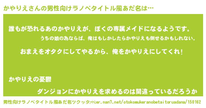 | 女子向けラノベタイトル風あだ名 | 『かやりえ恋絵巻』『かやりえ伯爵の花嫁』 |