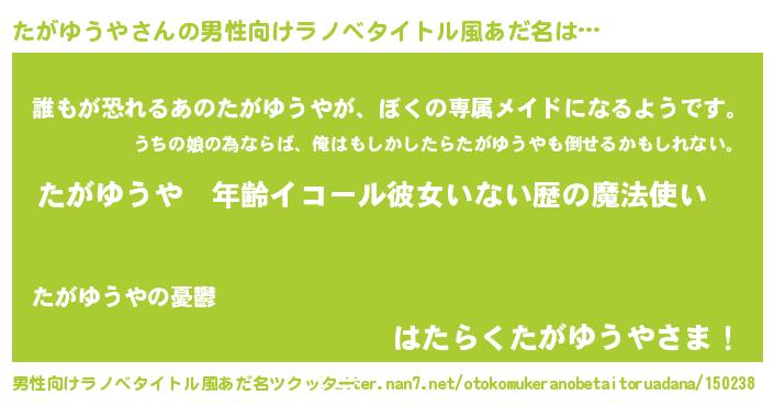 | 女子向けラノベタイトル風あだ名 | 『たがゆうやの玉の輿計画!』 |