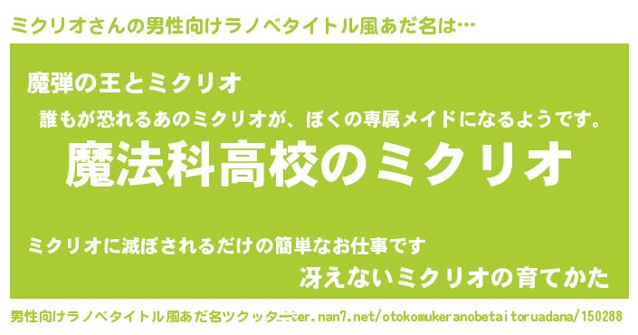 | 女子向けラノベタイトル風あだ名 | 『ミクリオなんてお断りですっ。』 |