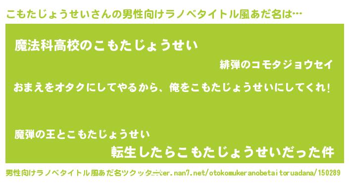 | 女子向けラノベタイトル風あだ名 | 『こもたじょうせい夫妻のなれそめ』 |