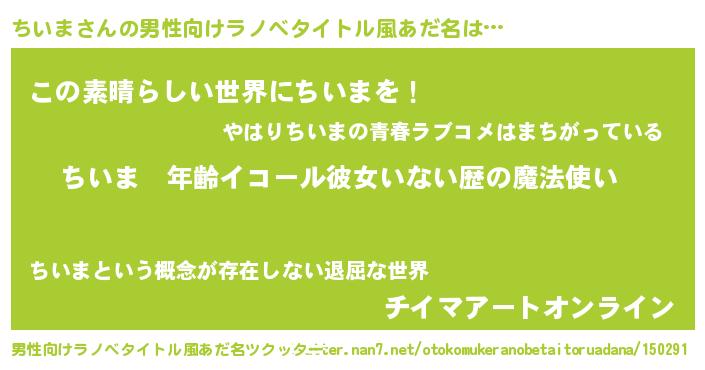 | 女子向けラノベタイトル風あだ名 | 『ちいまの玉の輿計画!』 |
