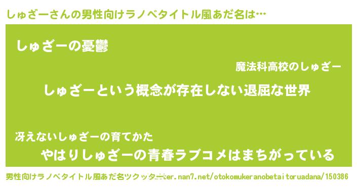 | 女子向けラノベタイトル風あだ名 | 『異世界で失敗しない100のしゅざー』 |