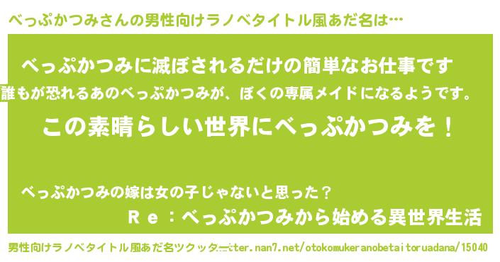 | 女子向けラノベタイトル風あだ名 | 『乙女ゲームの破滅フラグしかない悪役べっぷかつみに転生してしまった…』 |