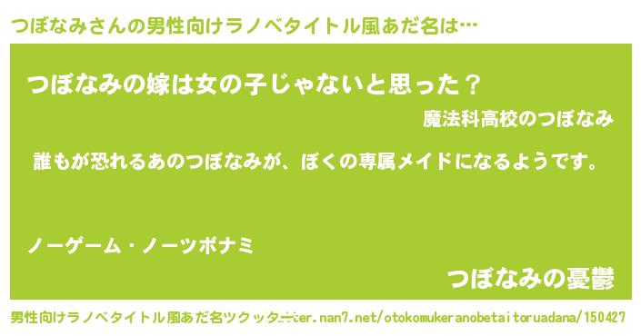 | 女子向けラノベタイトル風あだ名 | 『異世界でカフェつぼなみを開店しました。』 |