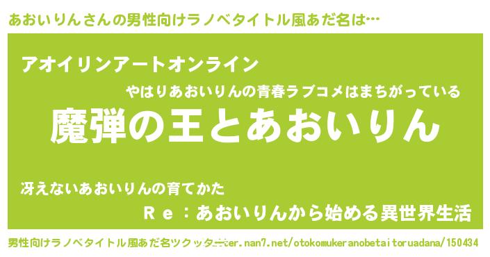 | 女子向けラノベタイトル風あだ名 | 『乙女ゲームの破滅フラグしかない悪役あおいりんに転生してしまった…』 |