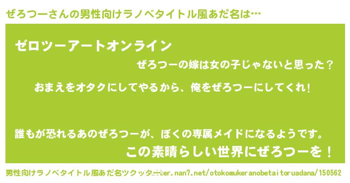| 女子向けラノベタイトル風あだ名 | 『ぜろつー恋絵巻』『ぜろつー様がみてる』 |