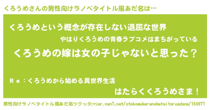 | 女子向けラノベタイトル風あだ名 | 『くろうめの卵を拾いまして』 |