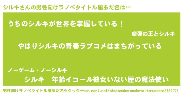 | 女子向けラノベタイトル風あだ名 | 『シルキの雑貨屋さん』『シルキ恋絵巻』 |