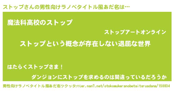 | 女子向けラノベタイトル風あだ名 | 『異世界で失敗しない100のストップ』 |
