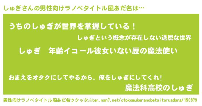 | 女子向けラノベタイトル風あだ名 | 『しゅぎの玉の輿計画!』 |