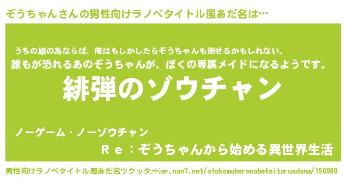 | 女子向けラノベタイトル風あだ名 | 『シンデレラぞうちゃん家の靴箱館』 |