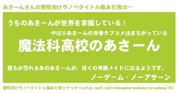 | 女子向けラノベタイトル風あだ名 | 『あさーんなんてお断りですっ。』 |