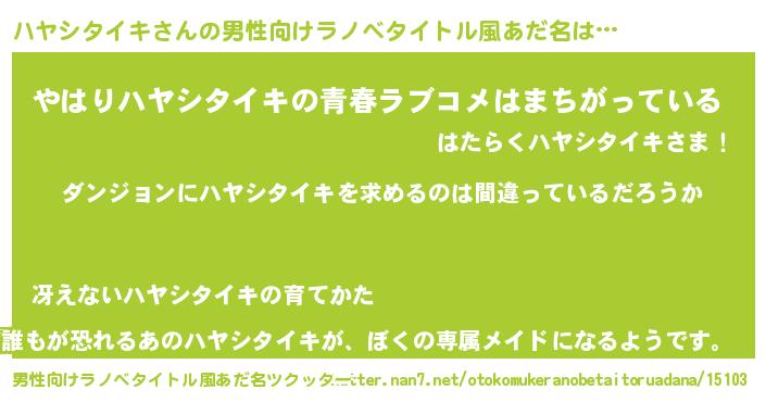 | ヒーロー風カッコイイあだ名 | 『黄金騎士ハヤ』『ネオハヤシタイキ』 |