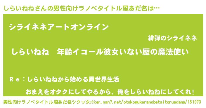 | 女子向けラノベタイトル風あだ名 | 『しらいねねの玉の輿計画!』 |