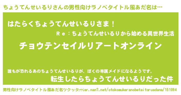 | 女子向けラノベタイトル風あだ名 | 『ちょうてんせいるり姫と円卓の騎士』 |
