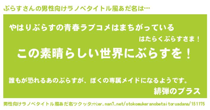 | 胡散臭い通販商品みたいなあだ名 | 『世界中を虜にした世界で10本だけ現存している希少なブランデー…その名も「ぶらす」』 |