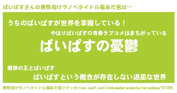 | 女子向けラノベタイトル風あだ名 | 『(仮)ばいぱすのやんごとなき事情』 |
