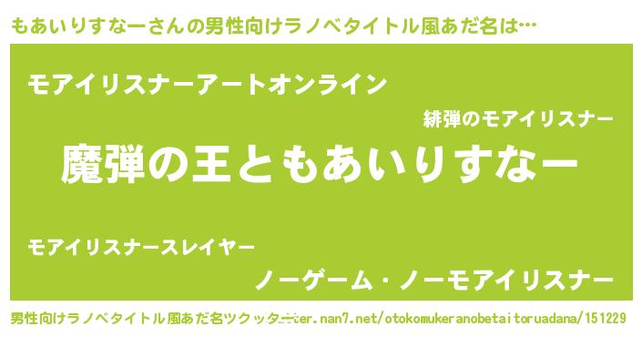 | 女子向けラノベタイトル風あだ名 | 『乙女ゲームの破滅フラグしかない悪役もあいりすなーに転生してしまった…』 |