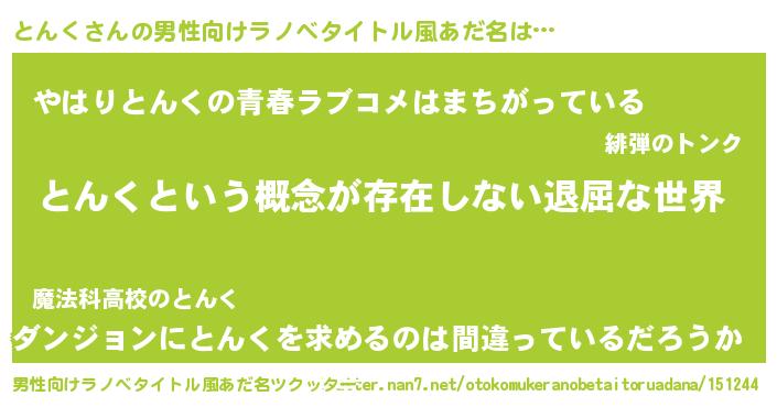 | 女子向けラノベタイトル風あだ名 | 『異世界で失敗しない100のとんく』 |