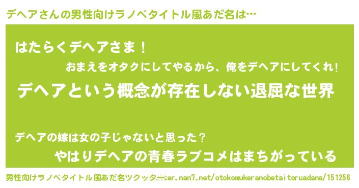 | 女子向けラノベタイトル風あだ名 | 『異世界で失敗しない100のデヘア』 |