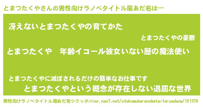 | 女子向けラノベタイトル風あだ名 | 『とまつたくやの玉の輿計画!』 |