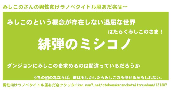 | 胡散臭い通販商品みたいなあだ名 | 『絶対に幸福をもたらす水素水…その名も「みしこの」』 |