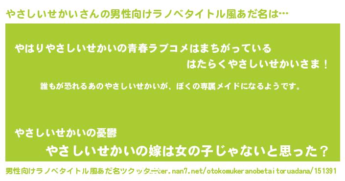 | 胡散臭い通販商品みたいなあだ名 | 『前代未聞の健康食品…その名も「やさしいせかい」』 |