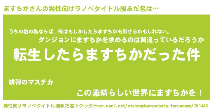 | 女子向けラノベタイトル風あだ名 | 『ますちかの玉の輿計画!』 |