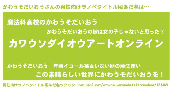 | 胡散臭い通販商品みたいなあだ名 | 『億万長者になれるブレスレット…その名も「かわうそだいおう」』 |