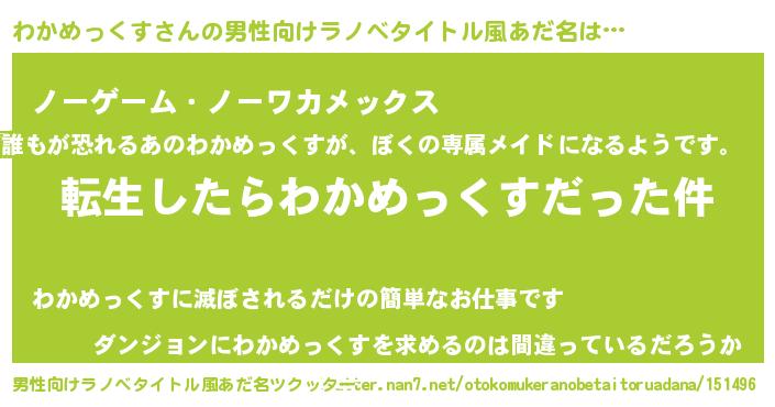 | 女子向けラノベタイトル風あだ名 | 『わかめっくすの玉の輿計画!』 |