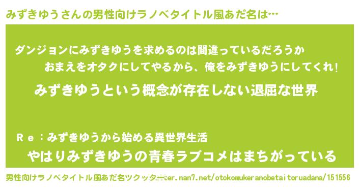 | 胡散臭い通販商品みたいなあだ名 | 『絶対に幸福をもたらす健康食品…その名も「みずきゆう」』 |