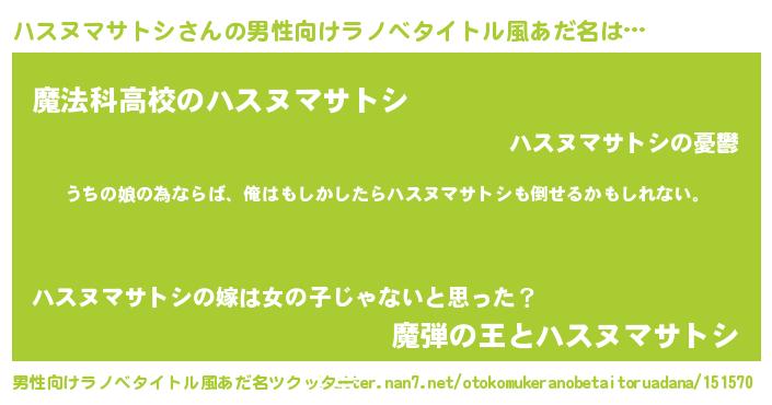 | 女子向けラノベタイトル風あだ名 | 『ハスヌマサトシ伯爵の花嫁』 |