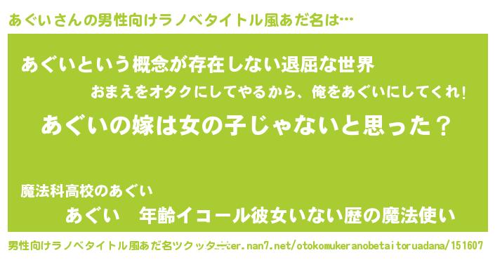 | 意味不明あだ名 | 『とにかく怪しいあぐい』『自称あぐい』 |