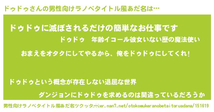 | 女子向けラノベタイトル風あだ名 | 『ドゥドゥ夫妻のなれそめ』 |