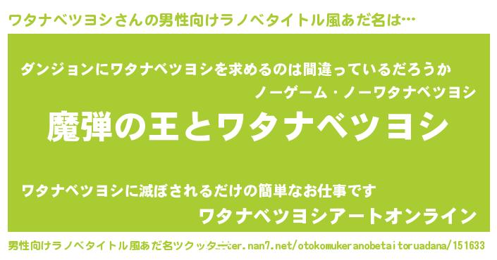 | 女子向けラノベタイトル風あだ名 | 『ワタナベツヨシが死なない童話 林檎のワタナベツヨシの診療簿』 |