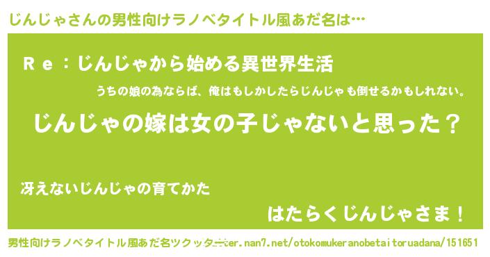 | 女子向けラノベタイトル風あだ名 | 『じんじゃの卵を拾いまして』 |