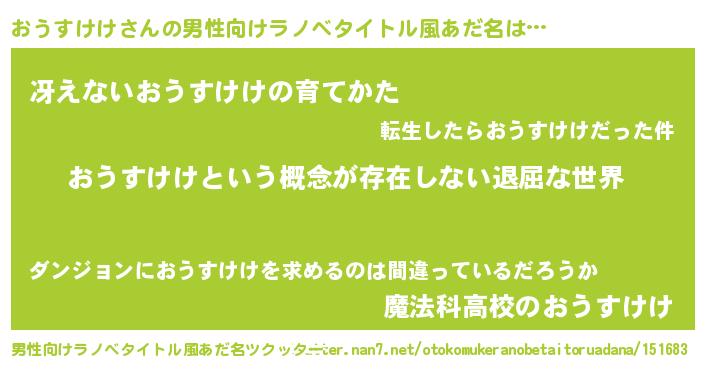 | 女子向けラノベタイトル風あだ名 | 『異世界で失敗しない100のおうすけけ』 |