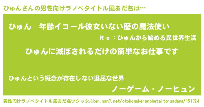 | ヒーロー風カッコイイあだ名 | 『慈愛の使者ひゅん』『究極戦士ヒュン』 |