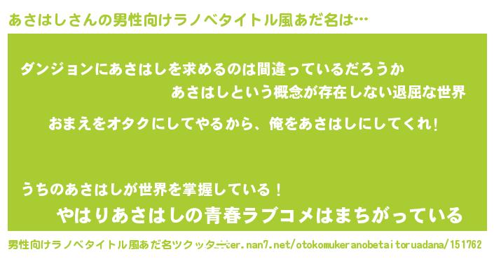 | 女子向けラノベタイトル風あだ名 | 『あさはし恋絵巻』『あさはしの契約王妃』 |