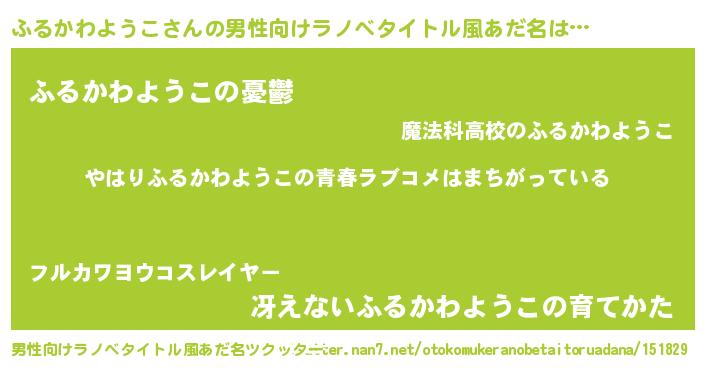 | 女子向けラノベタイトル風あだ名 | 『ふるかわようこ伯爵の花嫁』 |