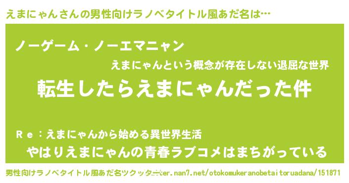 | 女子向けラノベタイトル風あだ名 | 『婚約破棄系悪役えまにゃんに転生したので、保身に走りました。』 |