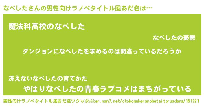 | 女子向けラノベタイトル風あだ名 | 『なべしたの卵を拾いまして』 |