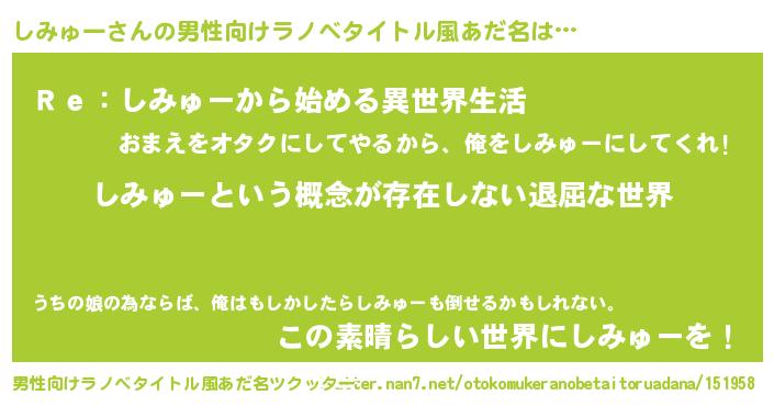 | 胡散臭い通販商品みたいなあだ名 | 『絶対に幸福をもたらす健康食品…その名も「しみゅー」』 |