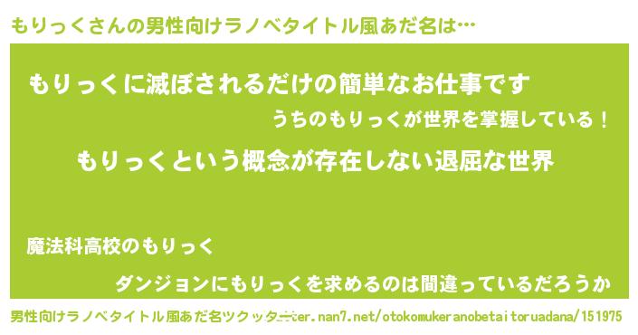 | 女子向けラノベタイトル風あだ名 | 『異世界で失敗しない100のもりっく』 |