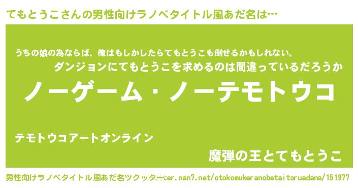 | 伝説のあだ名 | 『救世主となる錬金術士てもとうこ』 |