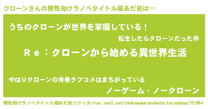 | 女子向けラノベタイトル風あだ名 | 『闇のクローン』『死神クローンの再婚』 |