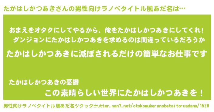 たかはしかつあきさんの男性向けラノベタイトル風あだ名をツクッター!