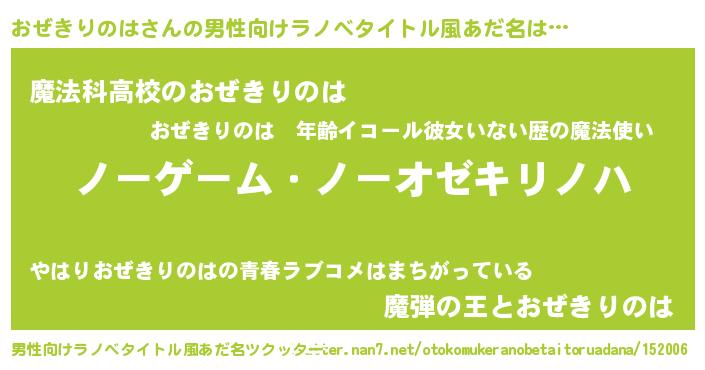 | 女子向けラノベタイトル風あだ名 | 『死神おぜきりのはの再婚』 |